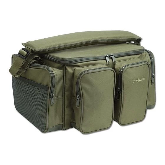 Compact carryall suitable for tackle storage and transport with a reinforced lid so it can be used as a bivvy table.